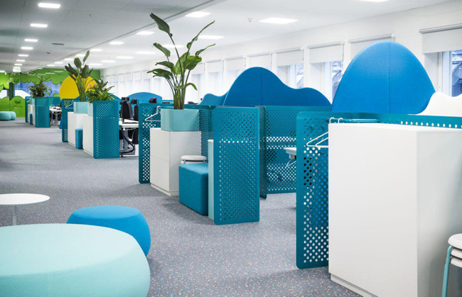 4、動漫公司辦公室裝修:以一個開放式的辦公環(huán)境為宗旨,旨在培養(yǎng)員工的團隊協(xié)作能力和溝通能力,而隨處可見的沙發(fā)座椅大大方便了員工之間的溝通交流。放松心情的辦公氛圍也使得靈感隨時都有可能迸發(fā),公司員工能夠享受到以任何自己喜歡的方式進行靈感的創(chuàng)作。除了主要的工作區(qū)域,辦公室的其他功能區(qū)也各具特色。以天然綠色為背景的圖書館能夠為員工提供寧靜安逸的閱讀空間,另外還有包括蹦床、球類等讓員工可以盡情玩樂游戲室,閑暇之余聊天放松的咖啡廳。而餐廳的設(shè)計有吸引力,將餐廳設(shè)計成一個復古的美式游樂園,搖椅或旋轉(zhuǎn)木馬般的座位,極具童心童趣。
